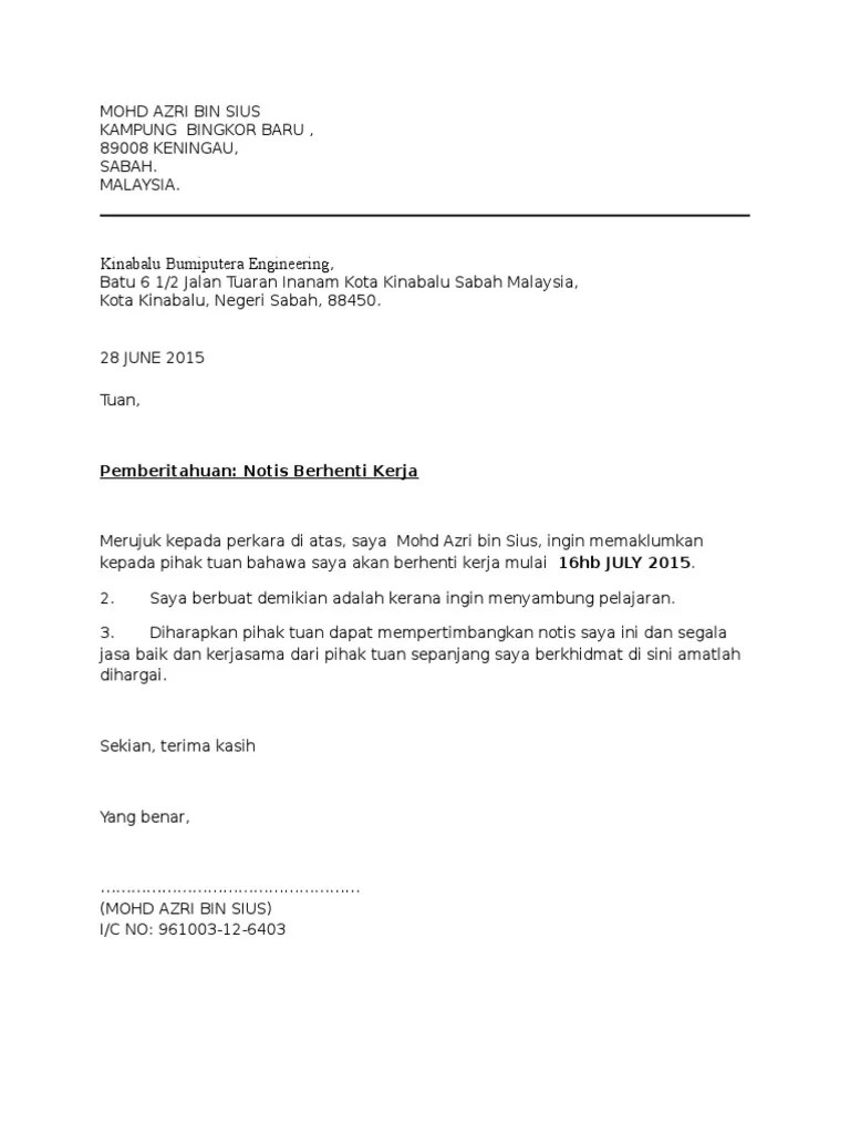 5 contoh notis berhenti kerja sebagai panduan ilabur. Kami rasa teraniaya diberhentikan kerja. Sebelum resign, hantar dulu surat kepada boss. Surat perletakan jawatan notis 24 jam & sebulan dalam bahasa melayu/ english bm bi. Contoh surat berhenti kerja & sebulan (bahasa inggeris & melayu).